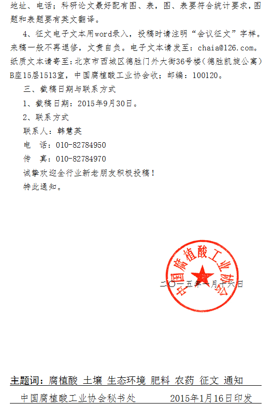 中國腐植酸網 地址:北京市西城區德外大街36號德勝凱旋大廈B座1513 電話:010-82035180 電子郵箱:chaia@126.com