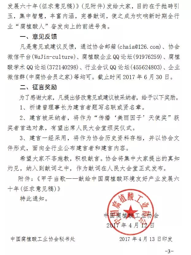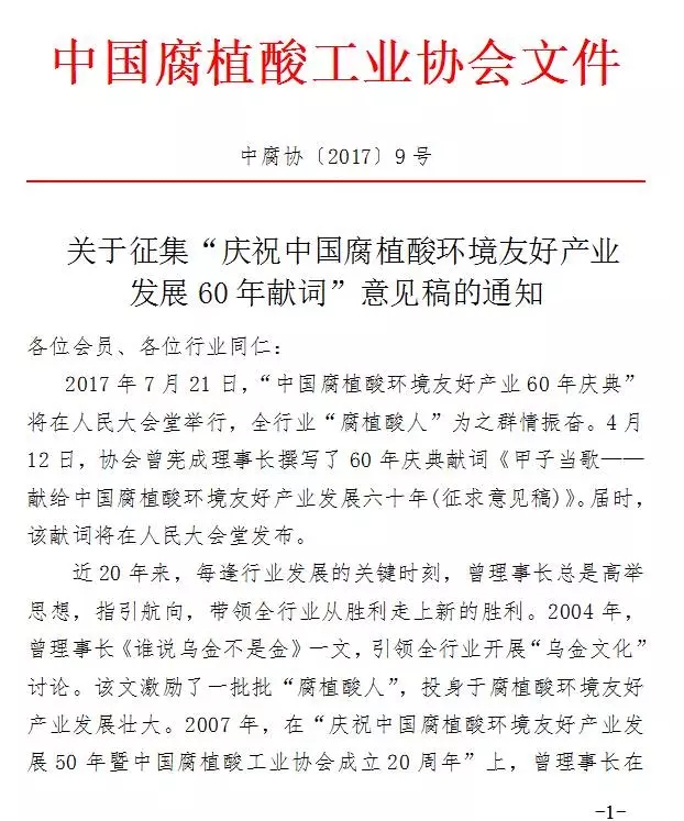關于征集“慶祝中國腐植酸環境友好產業發展60年獻詞”意見稿的通知