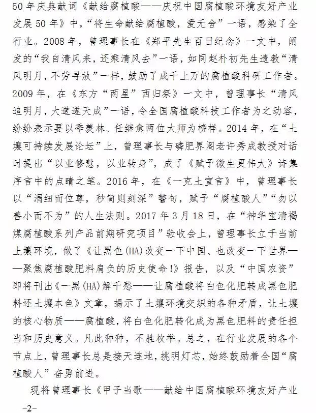 六十年,勿論歌者是誰,親歷者不論長短;只要意氣相投,勝似“一百單八將”。承運當前,把手天地。首相土肥,力轉霧霾。予土加養,潔食為開。崇尚道地,經綸博彩。一品著地,足讓碳匯。將工弄綠,著與細微。將身參過,素讓葷拍。將品入化,百般博愛。闊論基質,惟教城菲。高山仰止,綠色常懷……。如是自覺,如是生態。蓋世宏闊,當此賀歲。啊!腐植酸,吾愛吾世界;喜見一代又一代,行者多么豪邁。