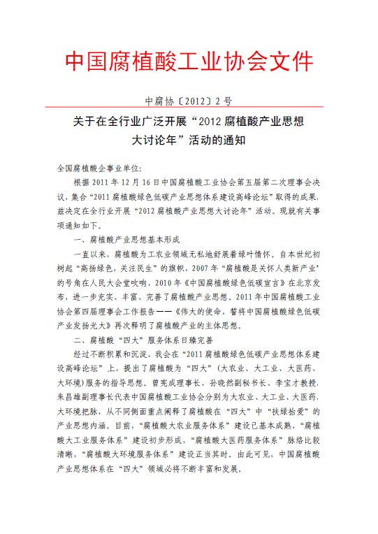 關(guān)于在全行業(yè)廣泛開(kāi)展“2012腐植酸產(chǎn)業(yè)思想大討論年”活動(dòng)的通知