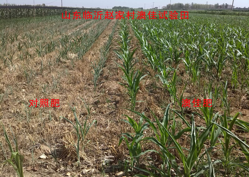 山東省臨沂市半山城鎮趙家村,5 月之后一直高溫少雨,沒有澆灌條件的玉米葉子都卷曲了,失水失綠。但是,趙國棟家的5 畝玉米卻鮮綠一片,與鄰家形成鮮明對比。據了解,趙國棟種地用澳佳肥已多年,在玉米種植時施用澳佳腐植酸玉米一次肥(氮磷鉀26%-5%-9%),一畝地一袋(40公斤),種肥同播一次底施。看到他家玉米長勢,其他農民投來羨慕的眼光。