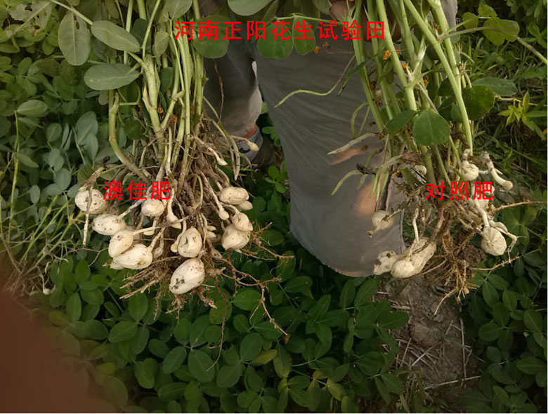 河南正陽大周寨王莊王建民,對北京澳佳有著深厚感情。他在花生地施用澳佳腐植酸專用肥(氮磷鉀12%-18%-18%),底肥畝用100斤,花生葉片厚且顏色暗綠,桿粗壯,高度均勻。他隨機拔出兩棵讓大家看,澳佳肥的花生座果率要高很多。湖北好年景澳佳創奇跡。