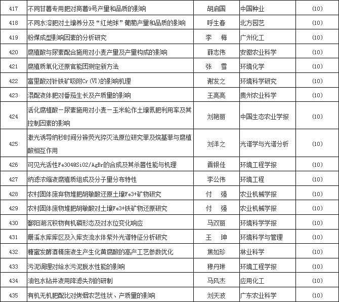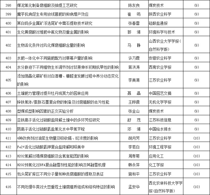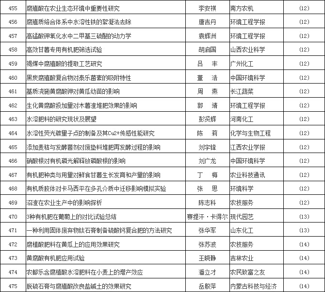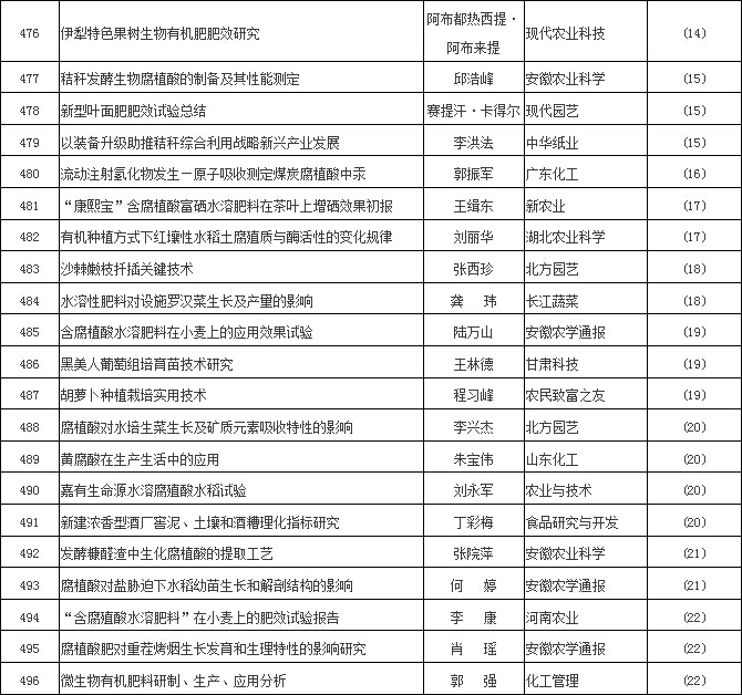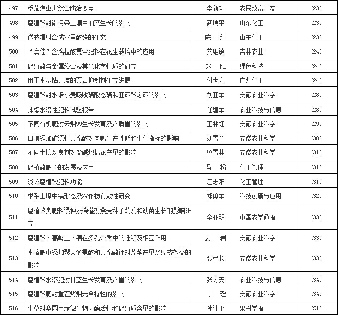 【編者按】2016年,腐植酸“美麗因子”,像出水芙蓉一樣“凈心釋愛”,腐植酸文獻就是最好的例證。茲依“中國知網”檢索,除《腐植酸》雜志外刊物,凡文獻摘要中含有腐植酸、腐殖酸、黃腐酸、棕腐酸、黑腐酸、胡敏酸、胡敏素、富里酸、腐殖質等9個關鍵詞者,2016年腐植酸類文獻共519篇,較2015年增加31.7%,為近10年腐植酸文獻數量之最。現將2016腐植酸文獻以序號、文章標題、第一作者、發表刊物和發表期次等五要素編輯刊出,與大家分享。
