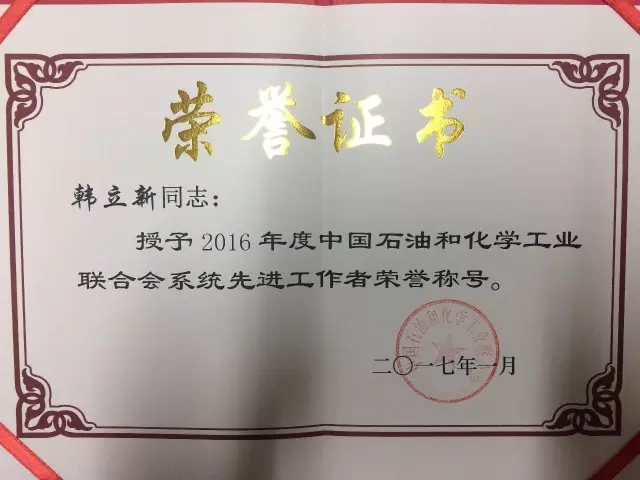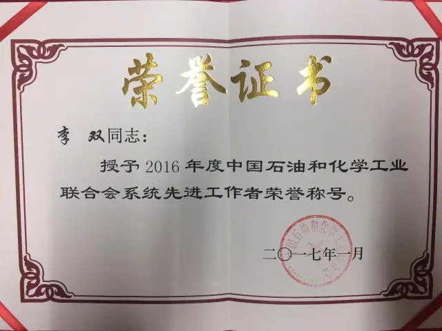 2017年2月14日,在“中國石油和化學工業聯合會系統2016年度總結表彰大會”上,協會技術開發部和會員部獲得了“中國石油和化學工業聯合會系統先進集體”榮譽稱號,韓立新、秦秀芝、李雙和沈占磊4名同志獲得了“中國石油和化學工業聯合會系統先進工作者”榮譽稱號。這是協會同仁全心全意服務全行業的最好回報。