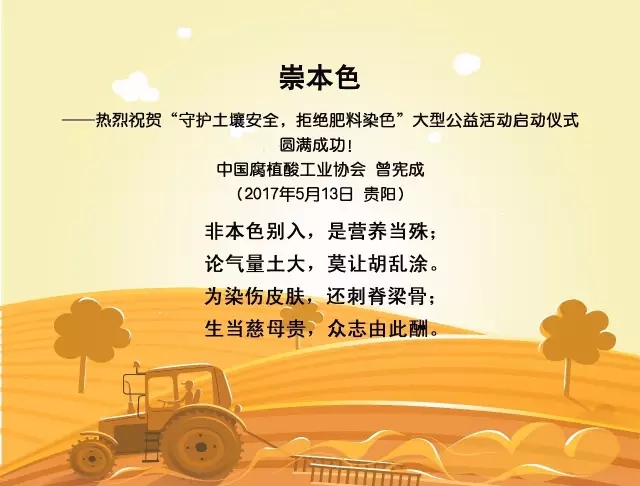 會上,曾理事長代表主辦方和全國農業技術推廣服務中心、國家化肥質量監督檢驗中心(北京)、中國農業生產資料流通協會、中國腐植酸工業協會、中國氮肥工業協會、中國磷復肥工業協會、中國無機鹽工業協會鉀鹽鉀肥行業分會等七大機構宣讀《“守護土壤安全,拒絕肥料染色”倡議書》:守護土壤安全,拒絕使用化肥染色劑,拒絕施用染色肥料,讓化肥回歸原生態,減少土壤污染,降低農民負擔,護佑中華沃土,為中國農業、為子孫后代播撒下無限福音!同時,曾理事長應主辦方特約,賦詩《崇本色》《盡開懷》2首,祝賀會議圓滿成功!