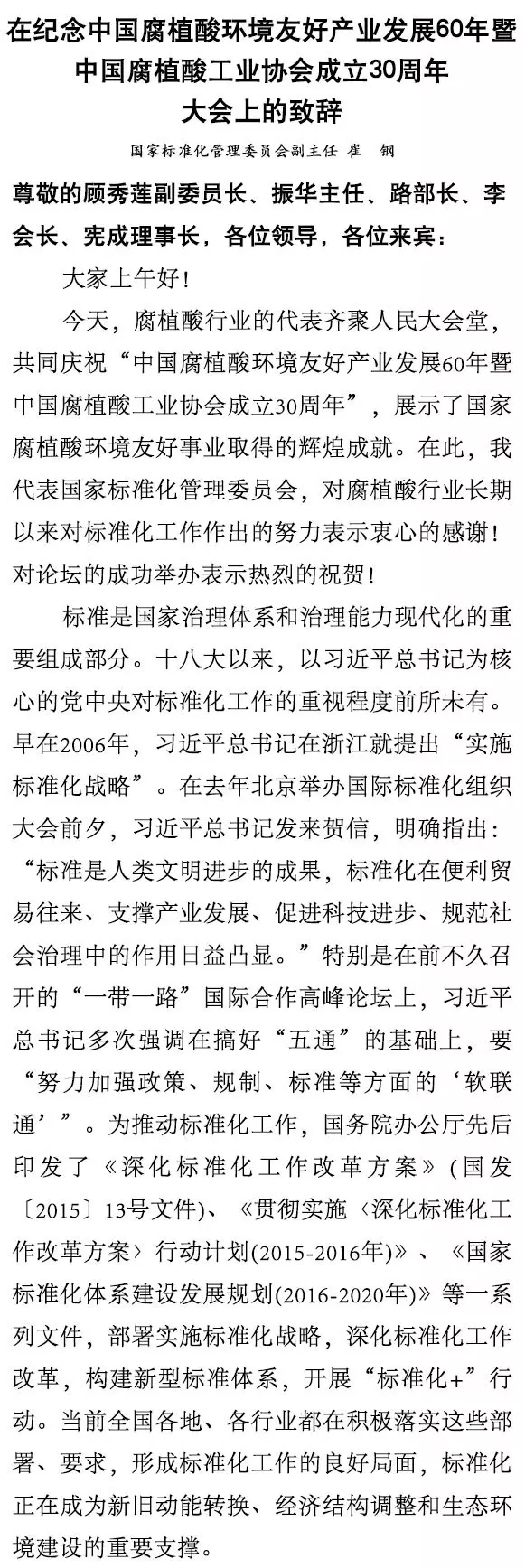 導言:2017年7月21日、22日,天風高闊,甘露降臨;慶典四象,百般和諧?!凹o念中國腐植酸環境友好產業發展60年暨中國腐植酸工業協會成立30周年慶典大會”、“中國腐植酸工業協會第六次會員代表大會”、“腐植酸綠色革命論壇”分別在北京人民大會堂和中國職工之家舉行,慶典系列會議取得了圓滿成功。今天,編發國家標準化管理委員會副主任崔鋼在慶典大會上的致辭全文。