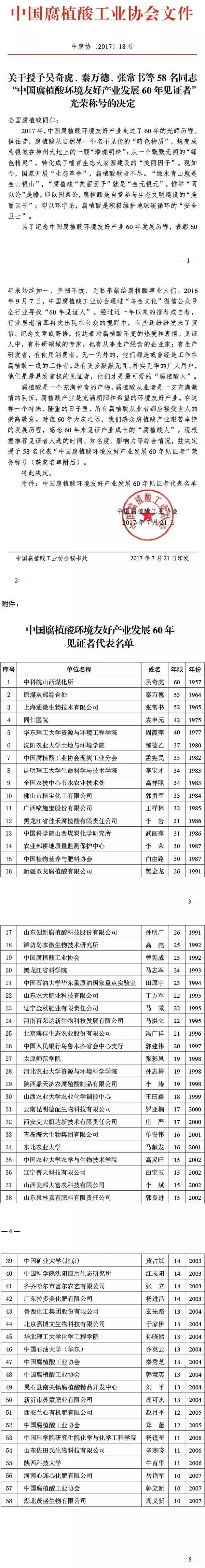 導言:2017年7月21日、22日,天風高闊,甘露降臨;慶典四象,百般和諧。“紀念中國腐植酸環境友好產業發展60年暨中國腐植酸工業協會成立30周年慶典大會”、“中國腐植酸工業協會第六次會員代表大會”、“腐植酸綠色革命論壇”分別在北京人民大會堂和中國職工之家舉行,慶典系列會議取得了圓滿成功。今天,編發關于授予吳奇虎、秦萬德、張常書等58名同志“中國腐植酸環境友好產業發展60年見證者”光榮稱號的決定。