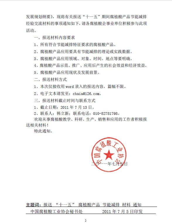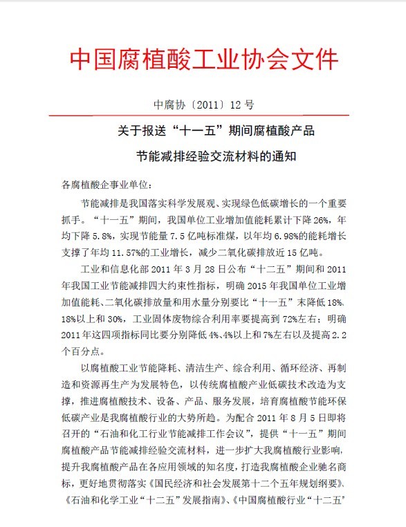關于報送“十一五”期間腐植酸產品節能減排經驗交流材料的通知
