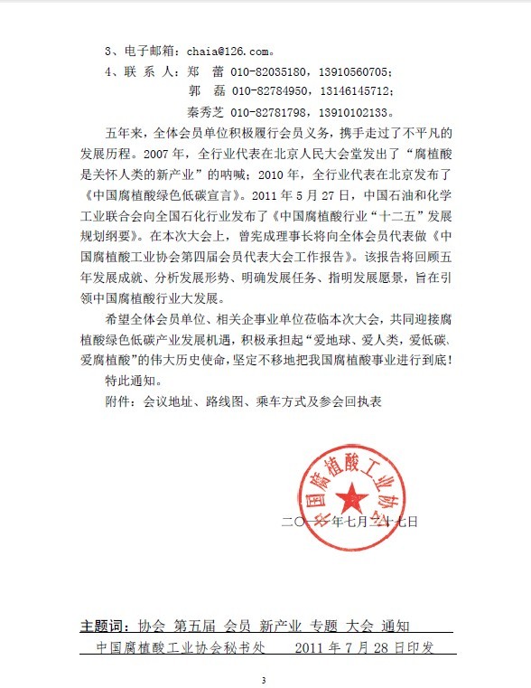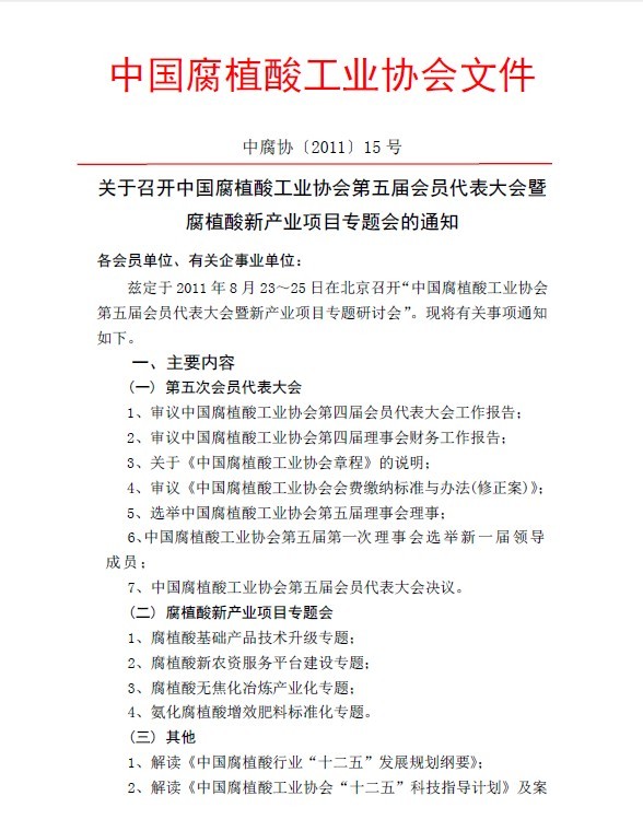關于召開中國腐植酸工業協會第五屆會員代表大會暨腐植酸新產業項目專題會的通知